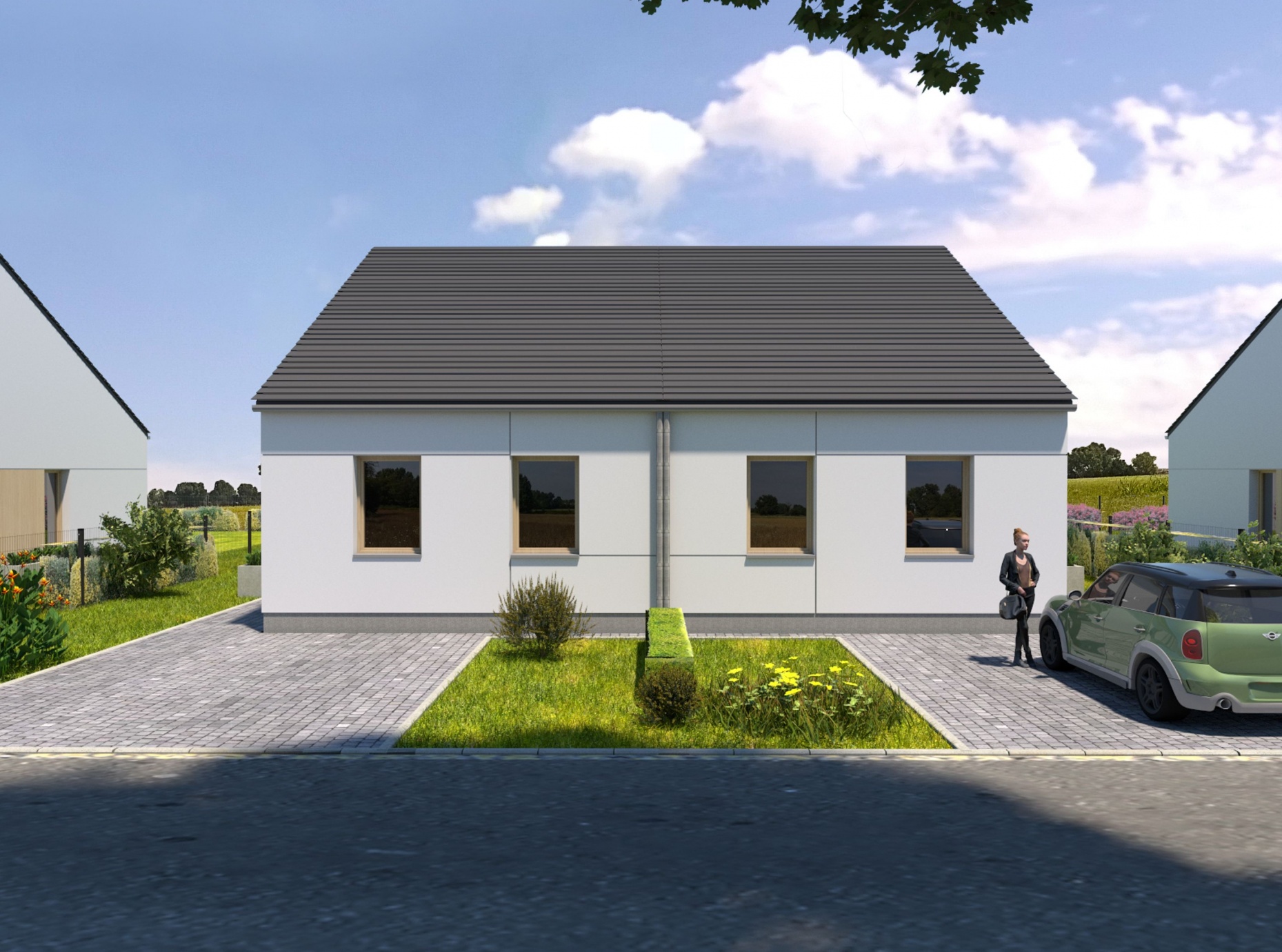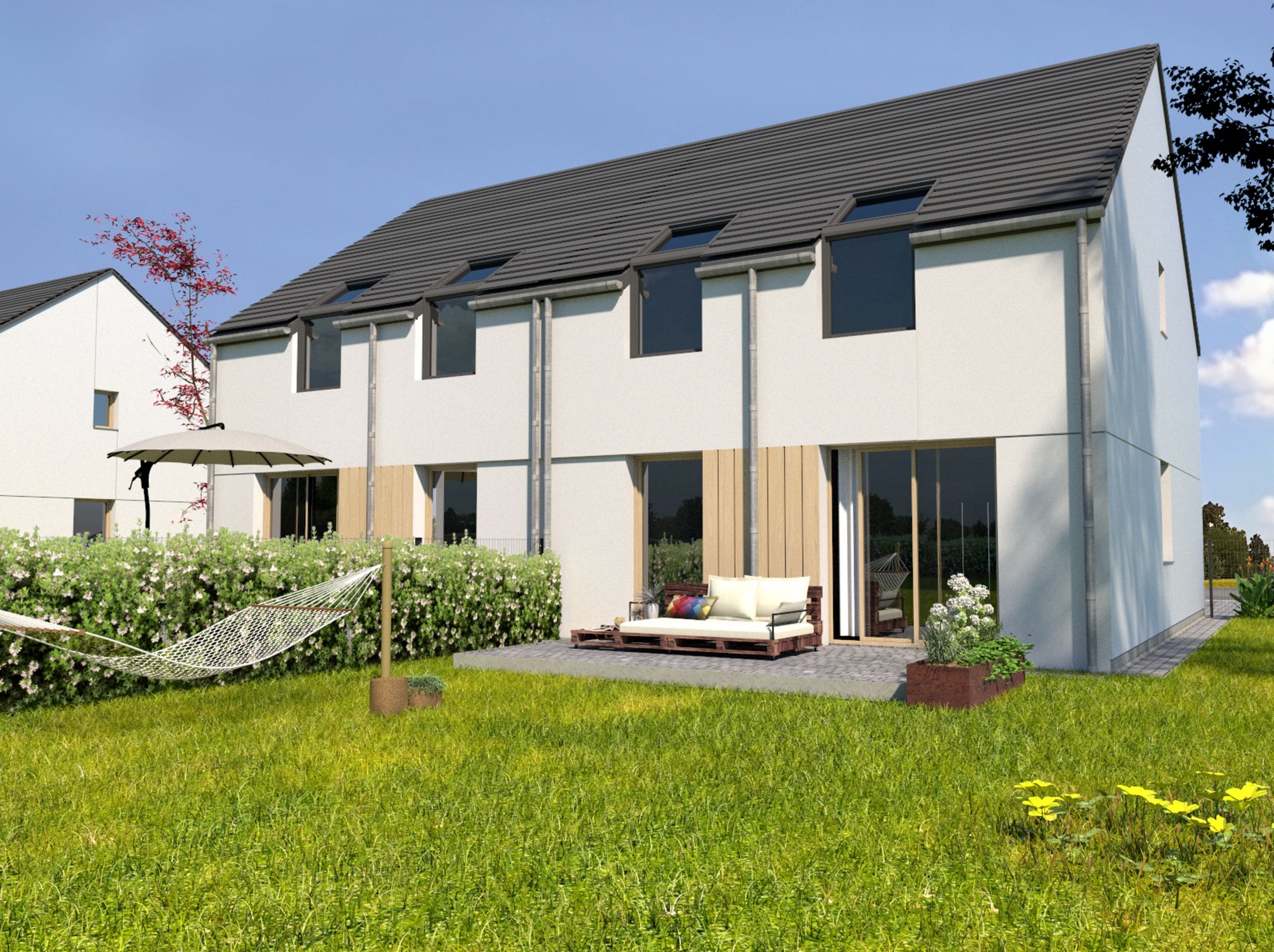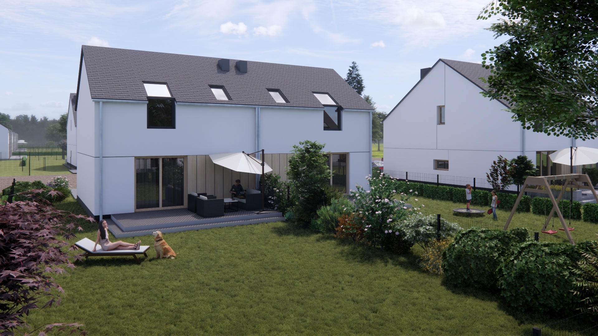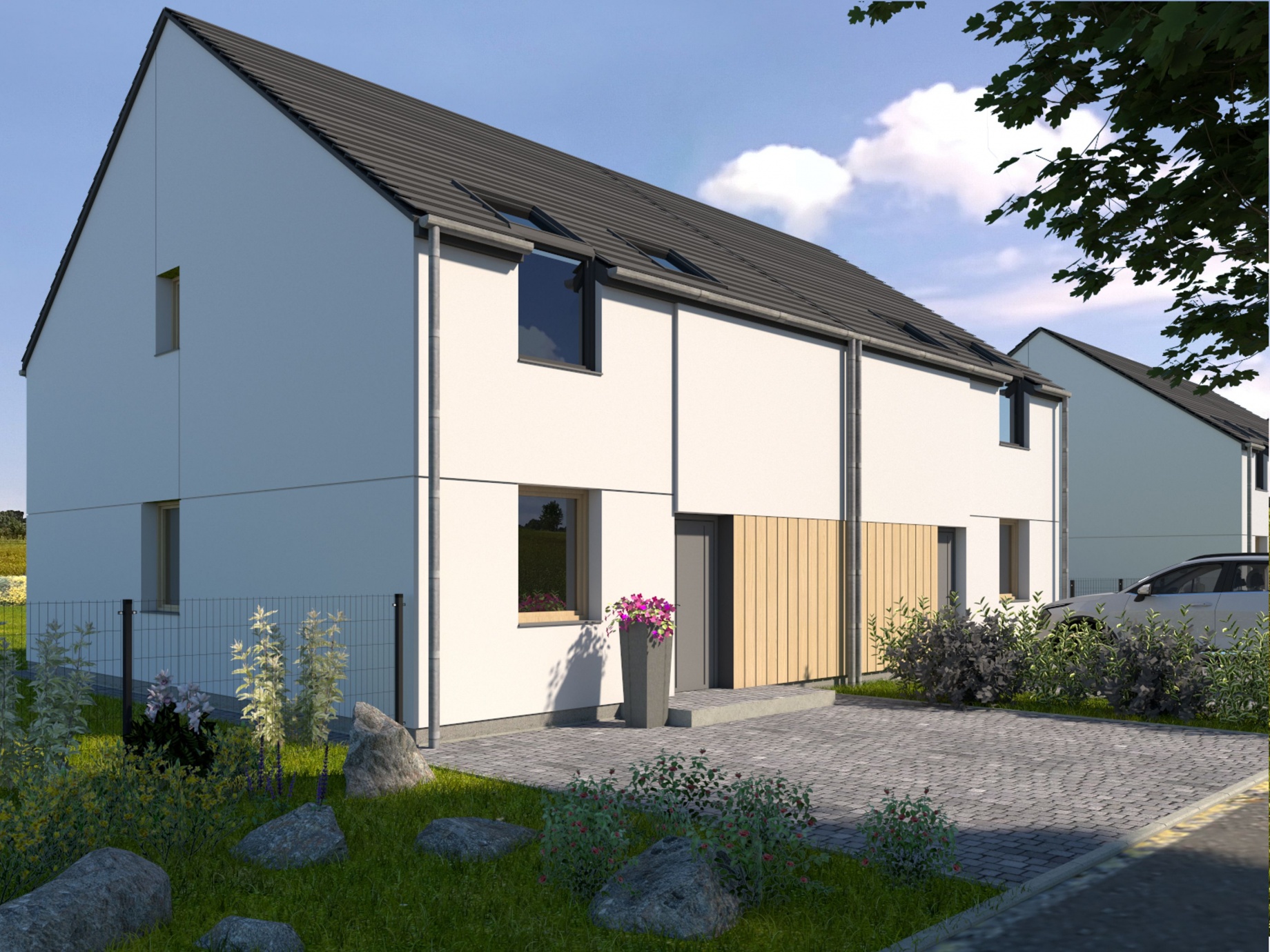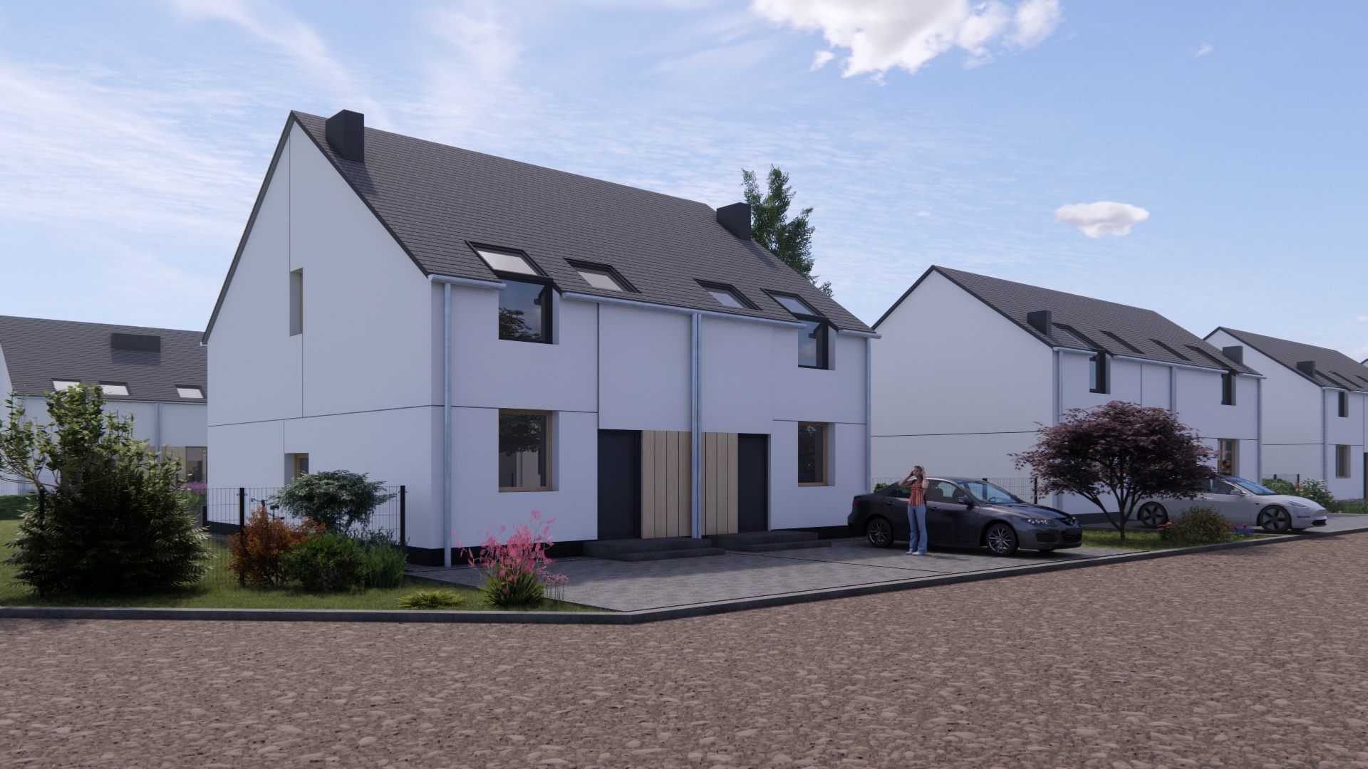 W tym urokliwym otoczeniu, z widoczną na horyzoncie Puszczą Zielonką, zaprojektowaliśmy nowoczesne osiedle kilkudziesięciu domów o zróżnicowanym metrażu. Do wyboru proponujemy domy: 60 lub 75 m2 z działkami 300 m2, 89 m2 z działkami 280 – 350 m2 oraz 101 lub 116 m2 z działkami 350 - 600 m2! Przewidziano także kilka wolnostojących domów o powierzchni 146 m2 z garażami, na działkach ok. 1200 m2.